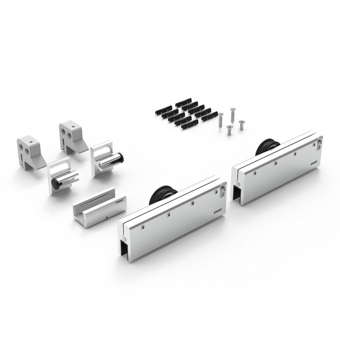 Set completo de accesorios con capacidad de carga de 90kg., para puertas correderas de vidrio que incluye 2 mordazas fijas con sujeción por presión, juego de 2 topes, juego de 2 soportes, 1 guiador de suelo y 10 clips para instalar tapeta embellecedora frontal.