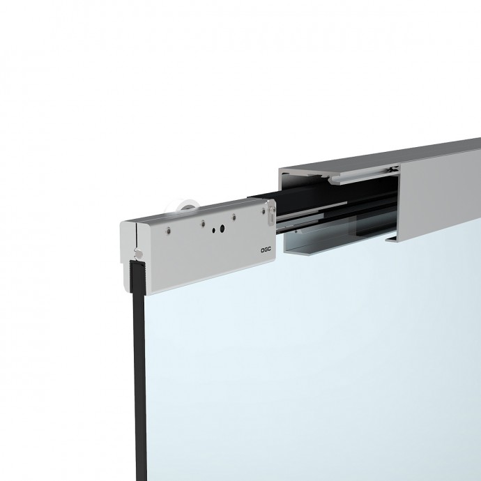 Set completo de accesorios con capacidad de carga de 90kg., para puertas correderas de vidrio que incluye 2 mordazas regulables con sujeción por presión, juego de 2 topes, juego de 2 soportes, 1 guiador de suelo y 10 clips para instalar tapeta embellecedora frontal.