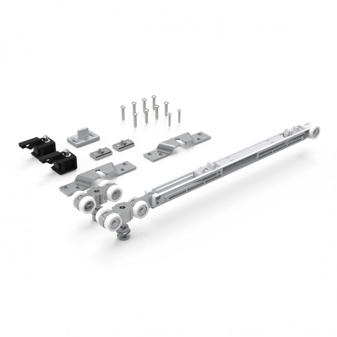 Set completo de accesrios con capacidad de carga de 90kg., con cierre suave para puertas correderas de madera, que incluye dos carros de cojinetes, pletinas fijación a puerta, juego de topes, guiador de suelo en plástico técnico en acabado gris, 2 softclose doble para cierre y apertura amortiguados y tornillería para su instalación.