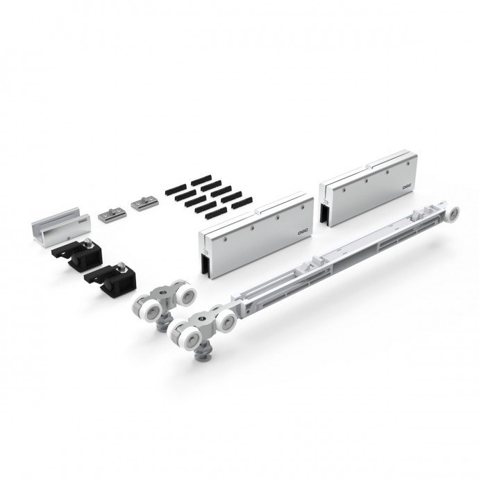 Set completo de accesorios con capacidad de carga de 90kg., para puertas correderas de vidrio que incluye 2 mordazas con sujeción por presión, 2 carros de rodamiento con regulación superior y softclose, juego de 2 topes, juego de 2 soportes y 1 guiador de suelo.